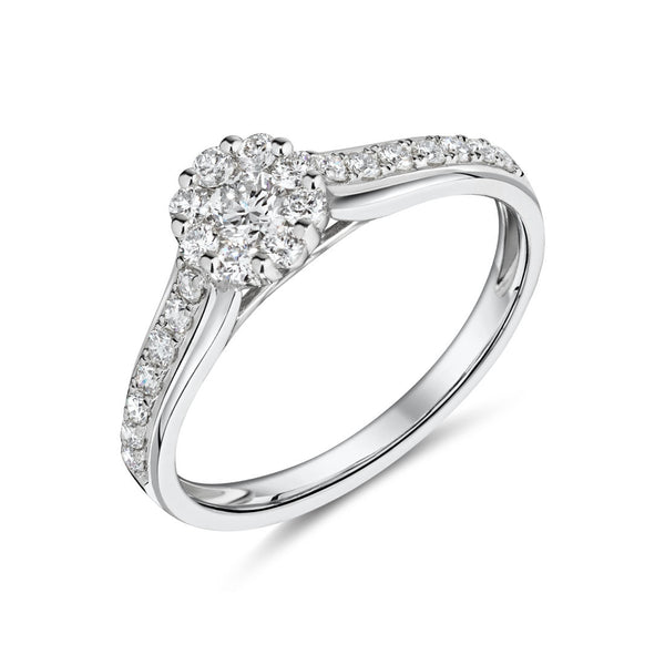 An elegant 18ct white gold engagement ring featuring a beautiful cluster of round brilliant diamonds. The perfectly matched diamonds sparkle in unison with additional shimmer provided by the diamond set shoulders. The total diamond weight is 55 points.