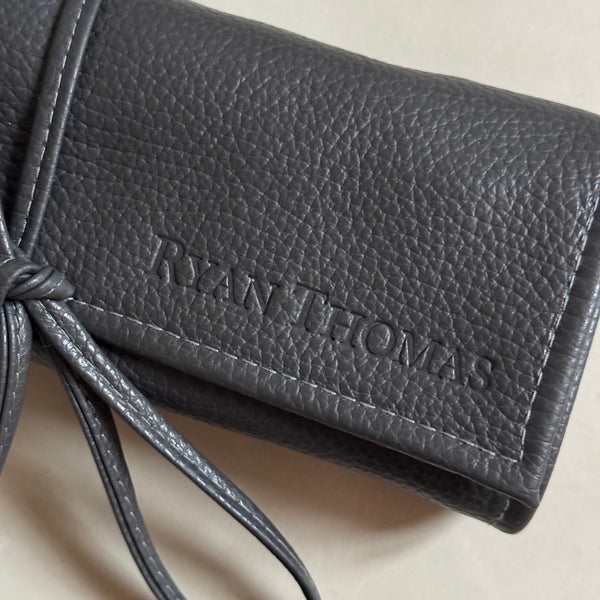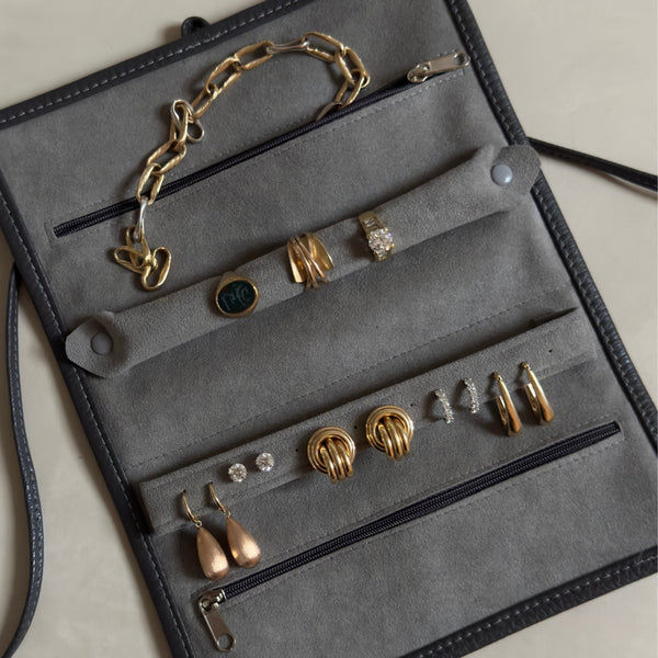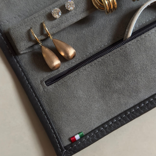 Launched to celebrate our 45th birthday, our limited edition jewellery roll is 100% crafted in Italy from natural leather. Featuring chic cool tones - a slate grey leather exterior and light grey suede interior. It makes the perfect home for your most loved jewellery, ensuring your cherished pieces are kept safe at home and on holiday.