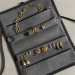 This jewellery roll has plenty of room for all your favourite rings, necklaces and bracelets, featuring two zipped compartments, a detachable roll for threading rings, and a detachable earrings holder. It fits perfectly into any handbag.