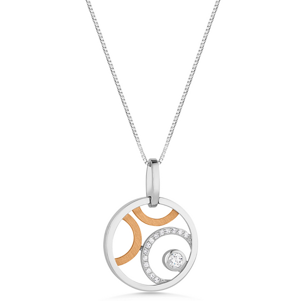 Beautiful diamonds sparkle brightly in this elegant pendant. Crafted from 14ct rose and white gold, the mix of metalware ensures versatility - they epitomise day to night style. Wear with the matching stud earrings to complete the look.