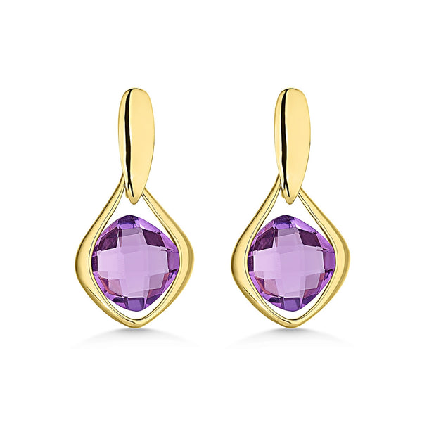 Crafted in Italy from 14ct yellow gold, these striking drop earrings feature beautifully cut amethysts and a gold surround. The beautifully cut facets of the amethyst gemstones ensure these eye-catching earrings find the light from every angle.