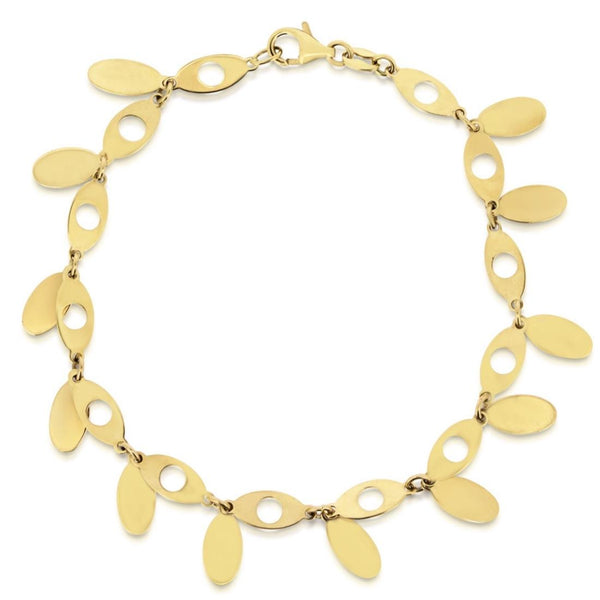 Elegant and timeless, this feminine link bracelet was crafted in Italy from 14ct yellow gold. Pretty charms of high polished, gleaming gold dangle and swish as you move. Its classic style makes it the perfect gift for a chosen loved one.