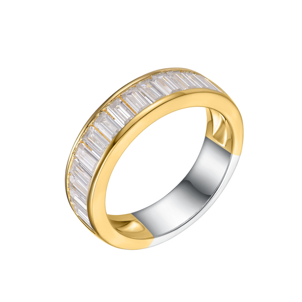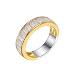 Glittering baguette cut cubic zirconia stones are the central feature of this gorgeous ring. Crafted from 14ct yellow gold microplated on sterling silver, the modern channel set design makes this ring stand out from the crowd.