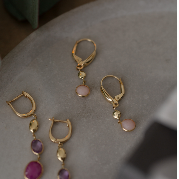 Crafted in Italy from 14ct yellow gold, these pretty drop earrings feature pink opal gemstones. We love the warm tone of the yellow gold beads and opal gemstones. Wear solo or stack with little gold huggies.