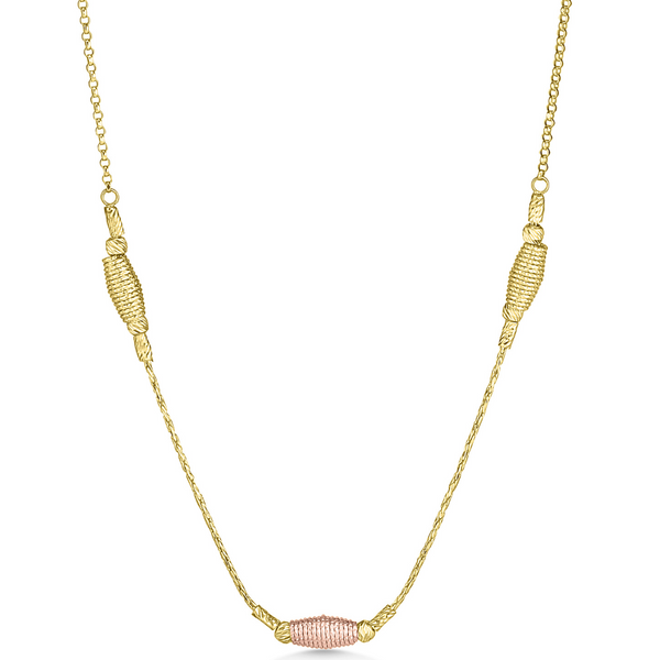 Crafted in Italy from 14ct yellow and rose gold, this pretty necklace features three contrasting central links. Wear solo, layer with more beaded styles or stack with one of our signature chunky necklaces. We adore this mixed metal look.