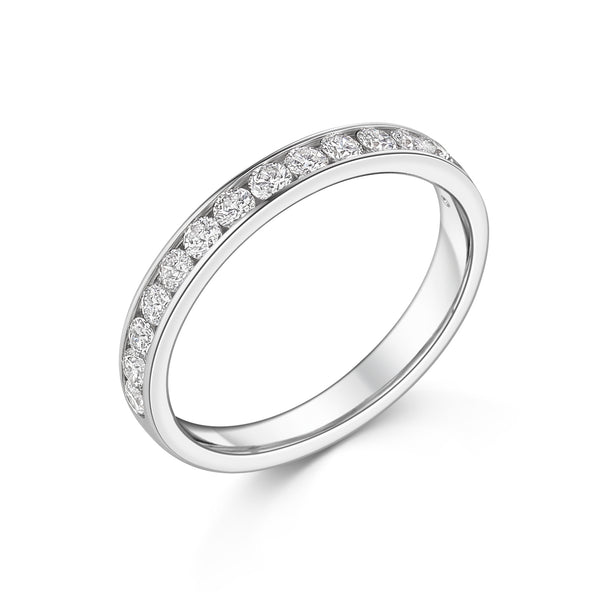Crafted from 18ct white gold, this band features 0.50-carats of glittering white diamonds. A superior colour G and SI1 in clarity, the half circle of diamonds looks beautiful stacked with a diamond engagement ring.