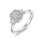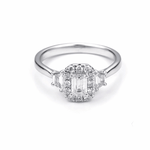 An elegant 18ct white gold diamond ring featuring a stunning emerald cut diamond as its principal stone. Accented by tapered baguette diamonds, the sparkle of the magnificent emerald cut centre stone is maximised by its halo of diamonds. The total diamond weight is 86 points.