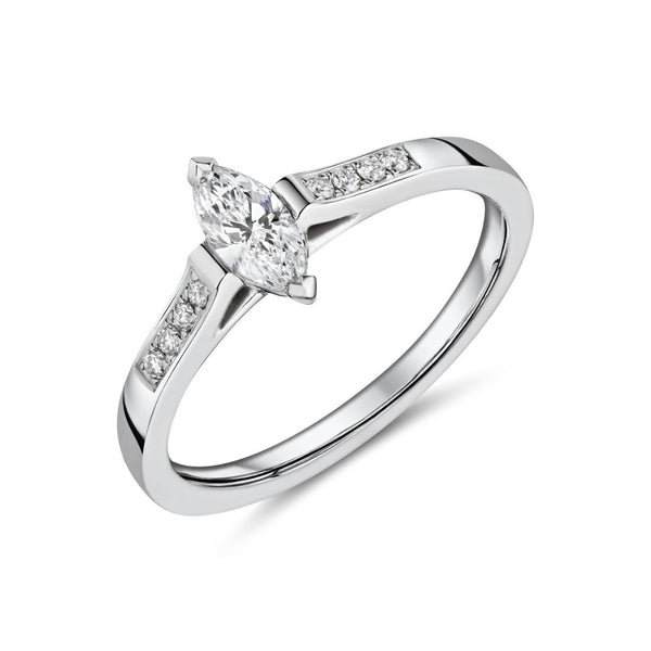 Some rings are reminiscent of contemporary art. A spectacular marquise-cut diamond is the focal point of this 18ct white gold diamond ring. This beautiful centre stone is complemented by channel set round brilliant diamond shoulders. The total diamond weight is 40 points.