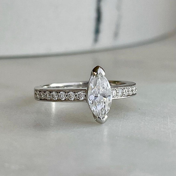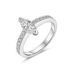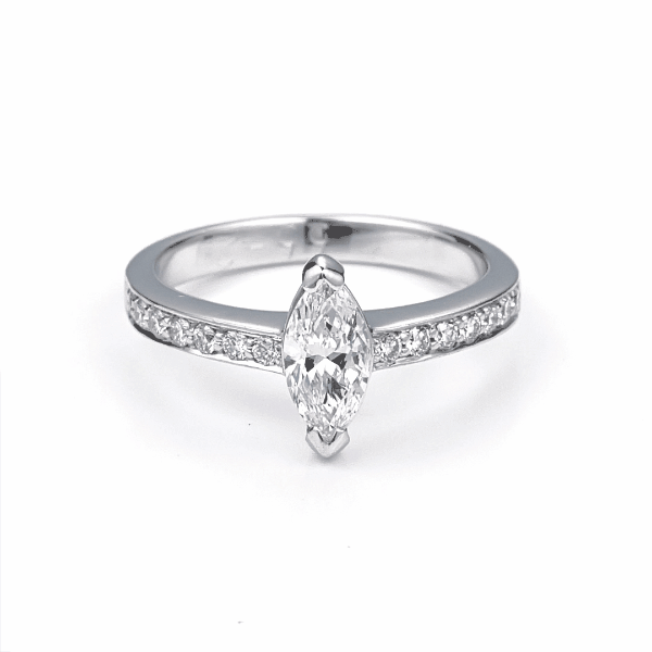 A modern 18ct white gold diamond ring set with a stunning marquise shaped diamond. The exceptional cut and quality of this hand selected marquise stone ensures the abundance of sparkle in this design. The diamond set shoulders further enhances its beauty. The total diamond weight is 59 points.