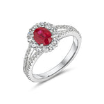 An elegant 18ct white gold ring featuring a beautiful 0.80ct oval cut ruby, enveloped by a sparkling halo of diamonds. The diamond set split shoulders complete this spectacular design. The total diamond weight is 0.75ct.