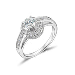 A unique 18ct white gold engagement ring featuring a principal round brilliant cut diamond of superb quality. Surrounded by a glittering diamond halo and completed with diamond set shoulders, it's striking in its unparalleled beauty.