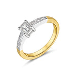 A striking 18ct yellow gold ring featuring a principal emerald cut diamond. This beautiful design is completed by princess cut diamonds, channel set in 18ct white gold and a gleaming 18ct yellow gold band. The total diamond weight is 83 points.
