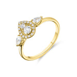 A distinctive vintage style ring featuring two graduated round brilliant cut diamonds, surrounded by a pear shaped diamond halo and flanked by pear cut diamonds on each side. Crafted from 18ct yellow gold, the total diamond weight is 24 points.