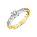 The timeless elegance of this 18ct yellow gold ring is achieved by its striking design. Set with a princess cut diamond as its principal stone, the sleek diamond shoulders are channel set with smaller princess cut stones. All of the diamonds are perfectly matched in their colour, cut and quality. The total diamond weight is 50 points.