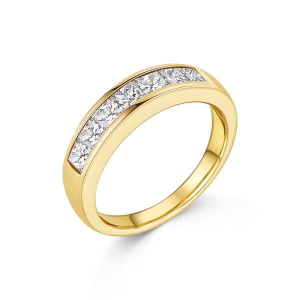 Crafted from 18ct yellow gold, this ring features 1.05-carats of glittering princess cut diamonds channel set in a high polished band.