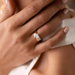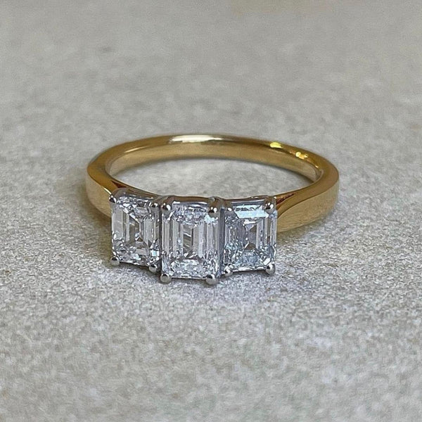 An emerald cut trilogy ring, featuring 1.60-carats of glittering lab grown diamonds. Crafted from 18ct yellow gold, this elegant and classic ring is testament to the beauty of emerald cut diamonds.