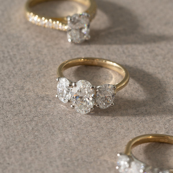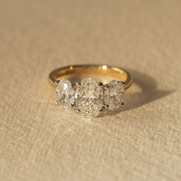 Crafted from 18ct yellow gold, this certified lab grown diamond ring features three glittering oval cut diamonds - the total diamond weight is 2.07ct. A modern trilogy design - representing the past, present and future of your love.