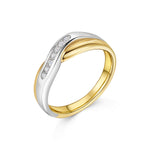 This 18ct white and yellow gold band features sparkling channel set diamonds set in white gold. The modern cross over design is beautifully finished.