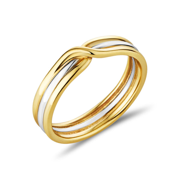 A contemporary 9ct two tone 4.5mm ladies wedding band, featuring an eye catching interweaved design.