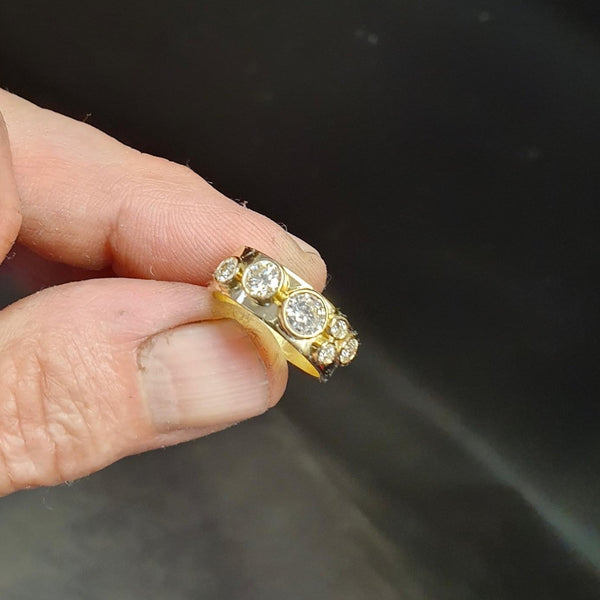 A total transformation of our customer’s existing rings into a sleek new design. Swipe to see the original rings beside the initial sketch designs & the process of handcrafting the new creation (using the gold & diamonds from the original rings), captured by our Goldsmith.