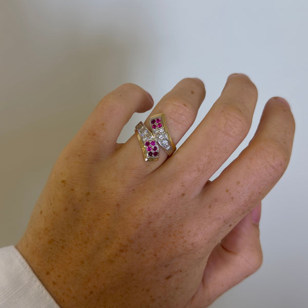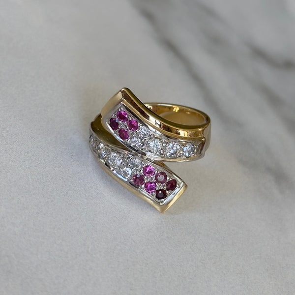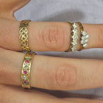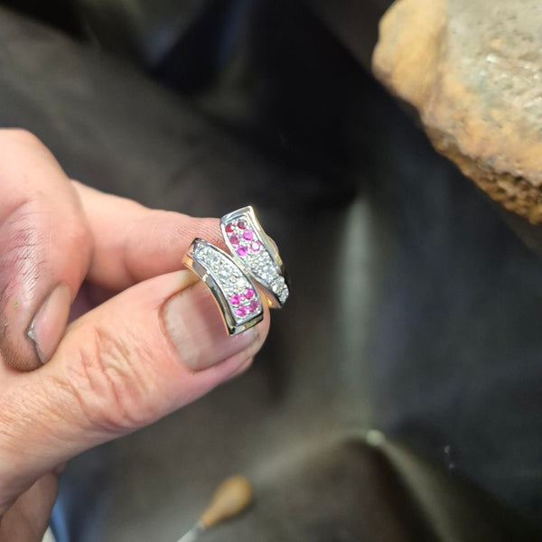 The remodelled ring was handcrafted from start to finish by our Goldsmith. We adore this distinctive design — the pairing of yellow & white gold, set with glittering diamonds & rubies.