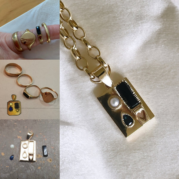 The onyx, heart design and gold from the original rings were incorporated into the handcrafted pendant, alongside a sapphire and pearl. These gemstones were chosen as they are his and her birthstones. These images show the original rings, alongside our Goldsmith's handcrafting process of the new pendant.