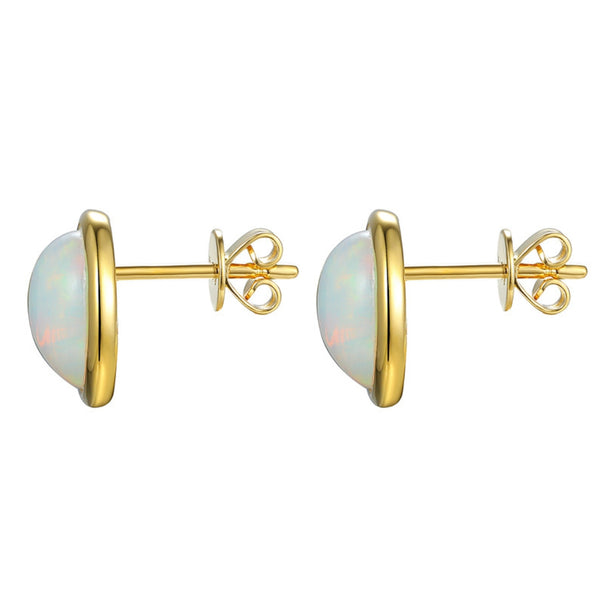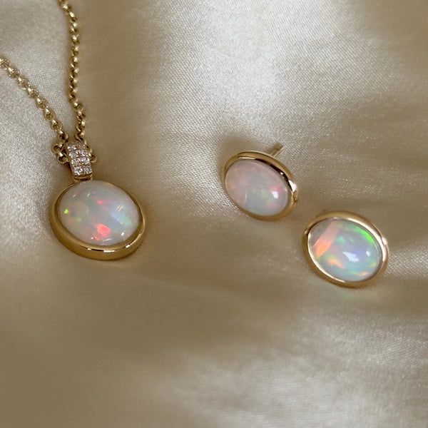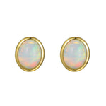 Crafted from 9ct yellow gold, these bezel set opal stud earrings feature natural Ethiopian oval opals - their beautiful colours testament to their superior quality. We adore these earrings worn with the matching opal and diamond pendant.