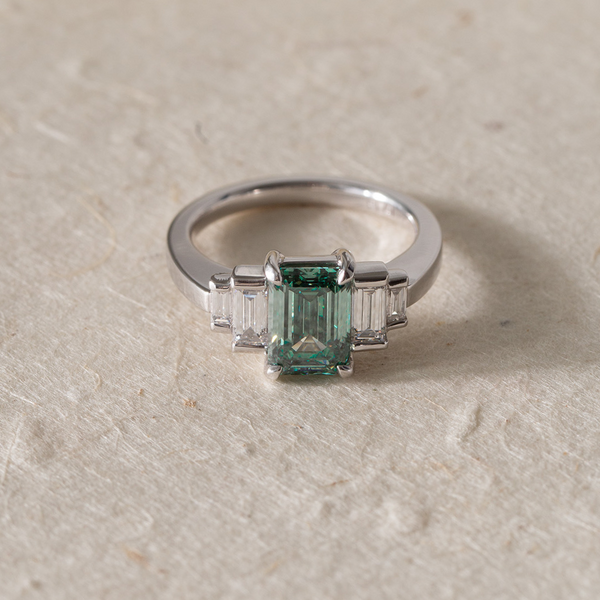 Introducing our Emerald Cut Teal Green Diamond Ring, featuring a 2.05ct green lab grown diamond, accented by baguette cut white diamonds. We had this modern art deco design in mind when we sourced this beautiful teal green diamond in Italy. An emerald cut stone, chosen for its incredible colour. Handcrafted from start to finish by our Goldsmiths in platinum.