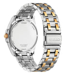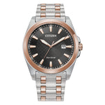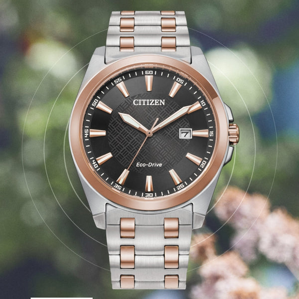 This gent’s watch from Citizen is an update on a classic that never goes out of style. The three-hand watch features a rose gold two-tone stainless steel case and bracelet, and a grey dial with a subtle pattern. It is sustainably powered by light with Citizen Eco-Drive technology, so it will never need a battery. Bold, elegant, and timeless, this classic watch is a must-have for every collection.