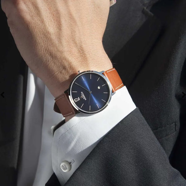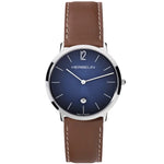 Sobriety and natural elegance, City, a chic watch for all occasions. This Herbelin watch is equipped with a steel case mounted with a brown leather strap. Its sunburst dial, of an intense blue, is marked by silver time indicators.