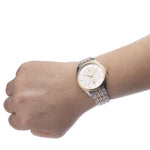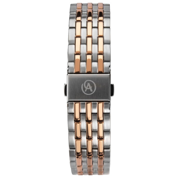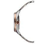 Fastened with a quick release, interchangeable, ion-plated rose gold and stainless steel bracelet; the case back is also engravable and the watch is water resistant up to 50 metres.