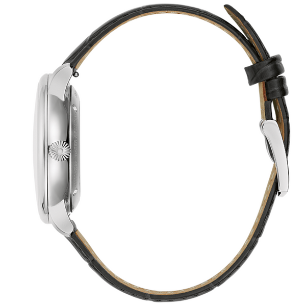 Dramatic, arced Roman numerals mark out 6 and 12 o’clock, complemented by polished baton markers and a 3 o’clock date display. The polished silver-tone hands complete the look of simple refinement. Inside the watch ticks an automatic movement, with 21 jewels and a power reserve of 42 hours.