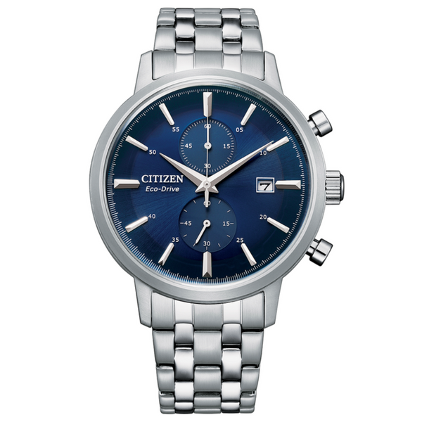 A classic design perfect for everyday wear, discover this Men's Chronograph from Citizen. Styled with a blue dial featuring silver-tone accents. This timepiece features a 1/5 chronograph that measures up to 60 minutes and date display. The look is completed with a stainless steel bracelet. Featuring Eco-Drive technology – powered by light, any light. Never needs a battery.