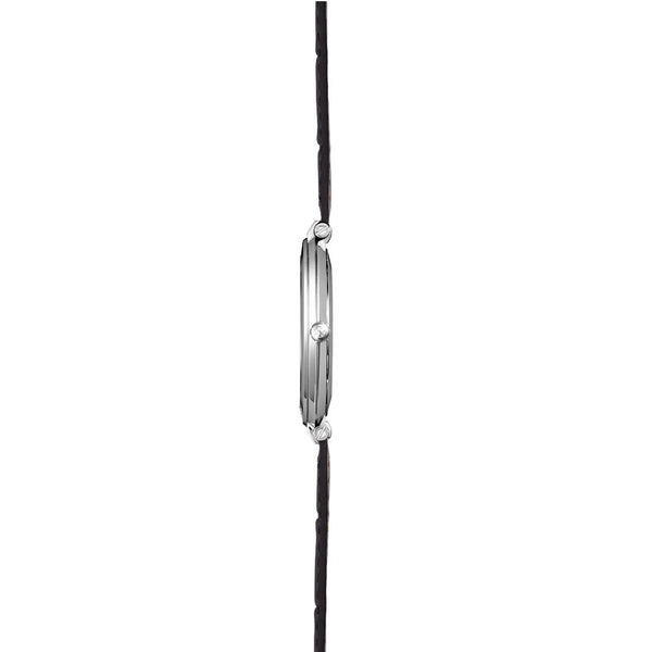 Cut into three meticulously chiseled facets, its polished finish sculpts the light. Punctuated with a blue dial marked with silver indexes, this watch is dressed with an alligator-style leather strap.