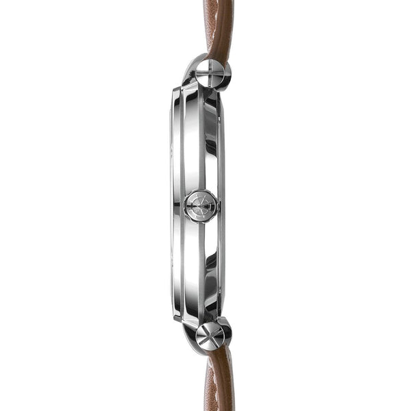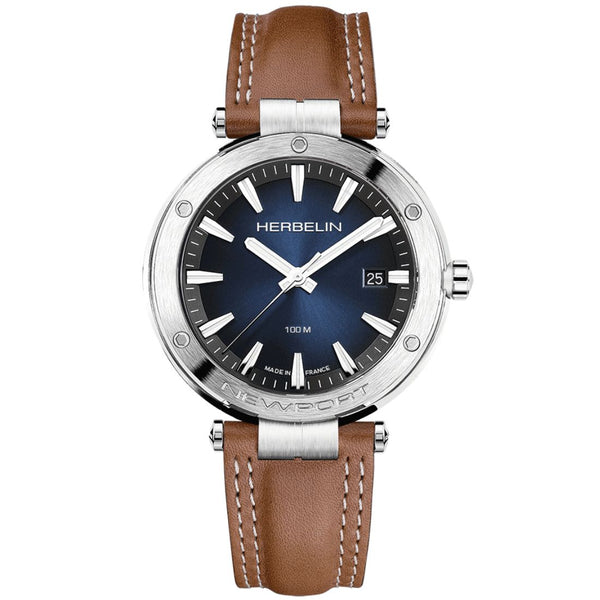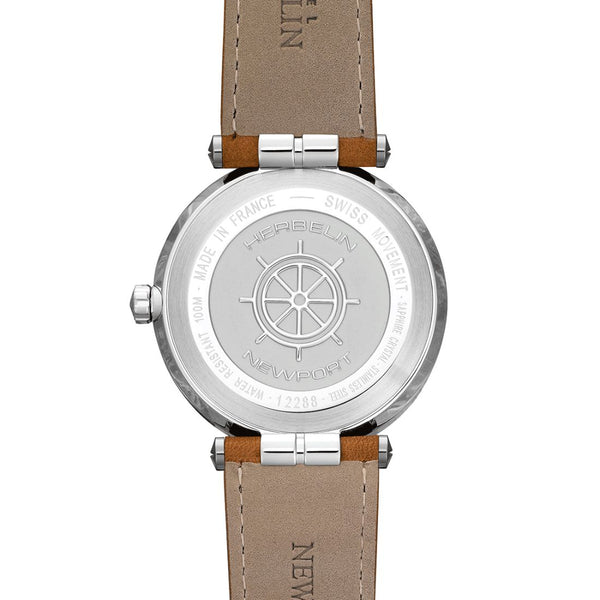 This Newport is dressed with a leather strap bringing a note of elegance to this sporty watch. The marine wheel engraved on the background perfectly illustrates Michel Herbelin's attention to detail.