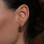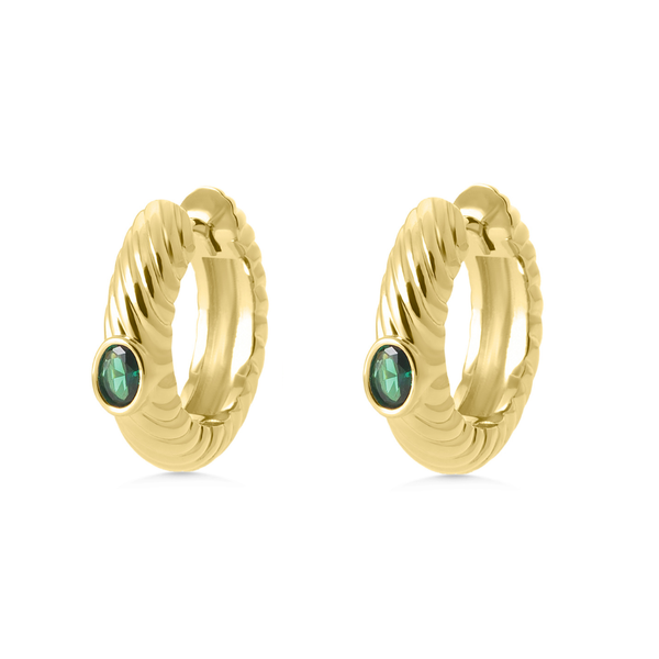 Inspired by sculptural shapes, these everyday hoops feature a delicate croissant shape, centered with a vibrant emerald-coloured stone. Pair with studs for an instant ear stack.