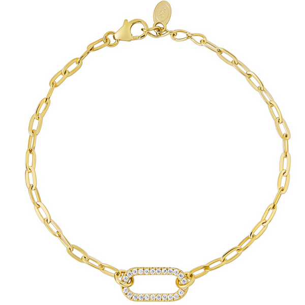 bracelet. Crafted from 18ct gold vermeil, it features a striking cubic zirconia set centre link. The paperclip-inspired links are perfect for everyday styling.