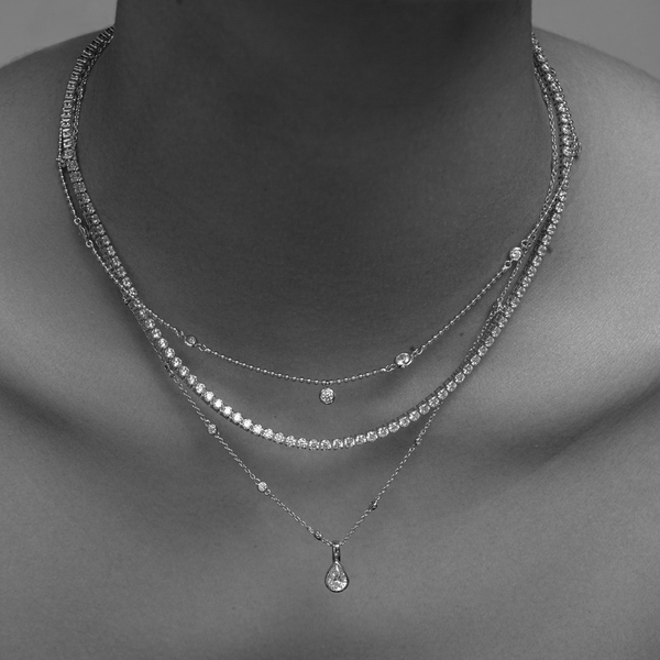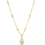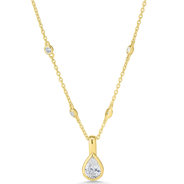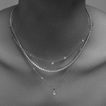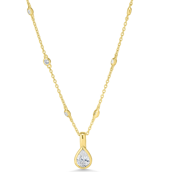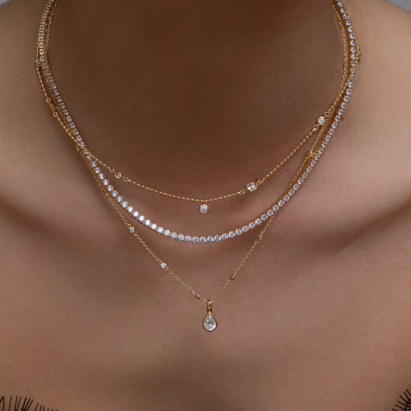 A best selling design to add your necklace layers. A delicate link chain is adorned with bezel set cubic zirconia. Finished with a sparkling pear cut gemstone. Layer with a base choker and chunky chain for everyday styling.
