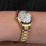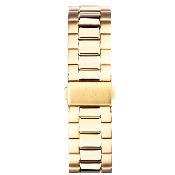 Fastened with an interchangeable gold ion-plated, stainless steel bracelet. This watch also has an engravable case back and is water resistant up to 50 metres.