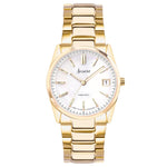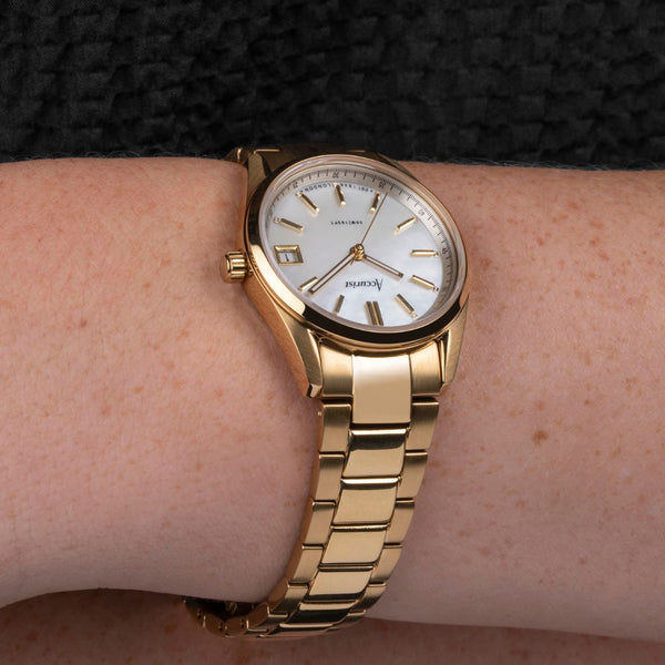 An everyday watch of extraordinary quality. Accurist Everyday watches are an essential accessory. This watch features a round, ion-plated gold solid stainless steel case housing a white Mother-of-pearl dial with diamond cut batons and a date display, enclosed by ultra scratch resistant sapphire crystal glass.