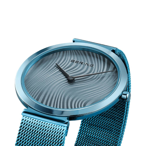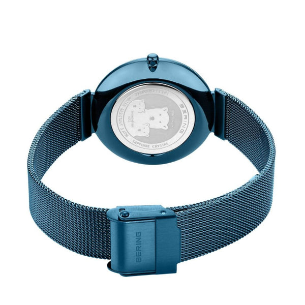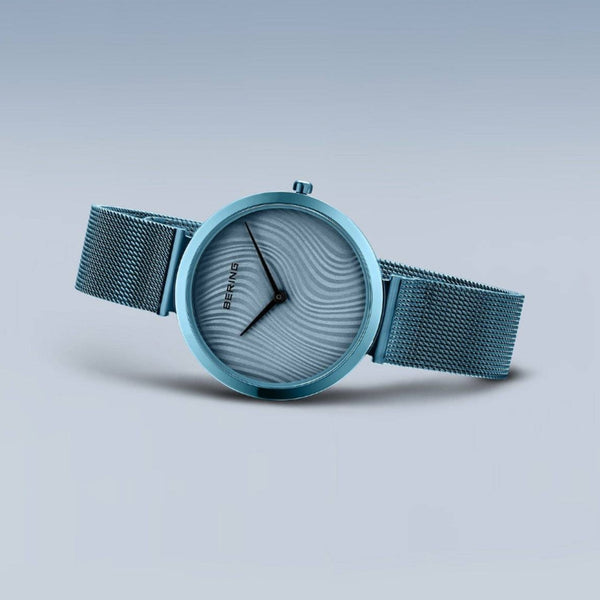 The polished, arctic blue stainless steel case, made of pure and high-quality stainless steel (316L), in combination with the noble Milanaise bracelet, provides a breathtaking look.