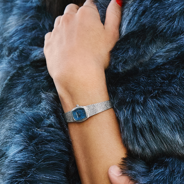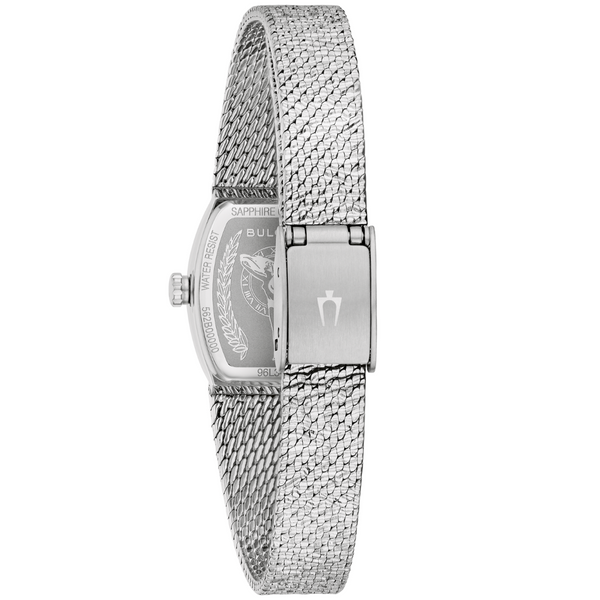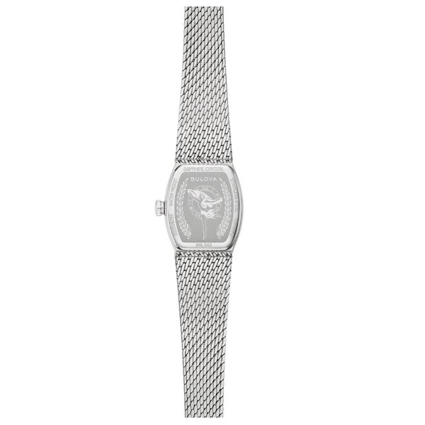 Each variegated genuine blue sodalite stone dial is completely unique and is appointed with silver-tone applied markers and matching hands, while Bulova’s Goddess of Time herself is etched onto the case back in intricate definition. Feel truly divine in this stunning Bulova ladies’ timepiece.