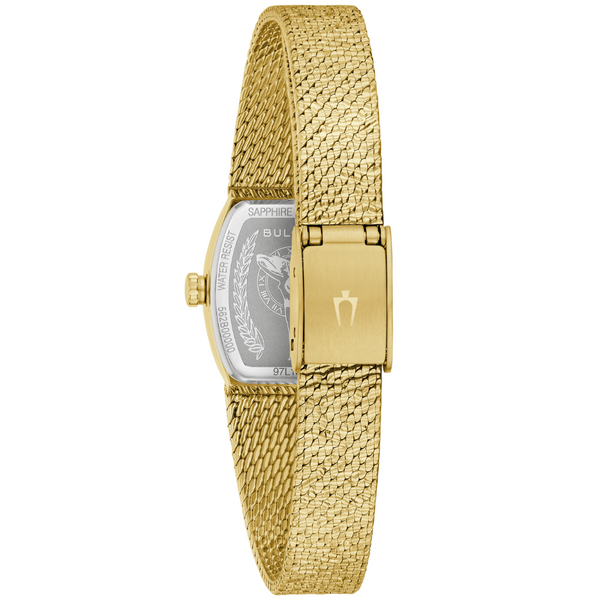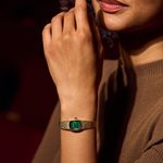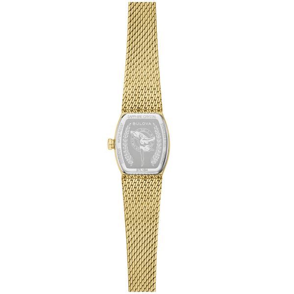 Each striated green genuine malachite dial is completely unique and is appointed with gold-tone applied markers and matching hands, while Bulova’s Goddess of Time herself is etched onto the case back in intricate definition. Feel truly divine in this stunning Bulova ladies’ timepiece.