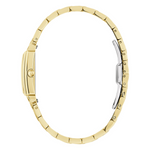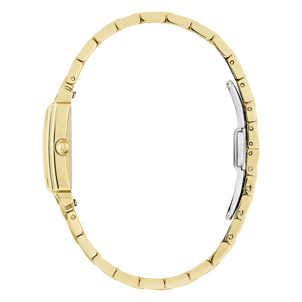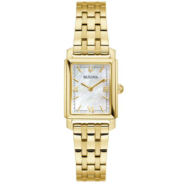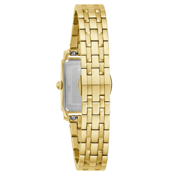 A matching five-link gold-tone stainless steel bracelet features a deployant closure with pushers for a perfect fit and latched spring bars for easy release. This Bulova ladies’ timepiece offers an understated sense of luxury for the woman with an elevated sense of style. .