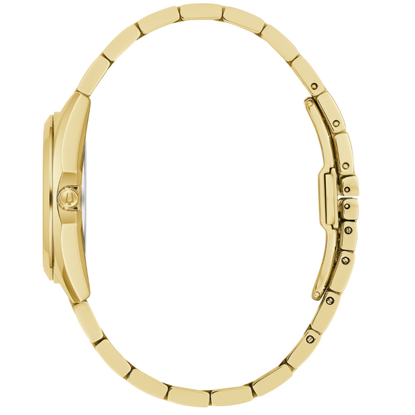 The lustrous mother-of-pearl dial offers a sophisticated radiance, appointed with 11 diamond hour makers and a gold-tone handset. With strikingly beautiful details and flair, this Bulova ladies’ timepiece brings timeless elegance to any occasion.