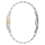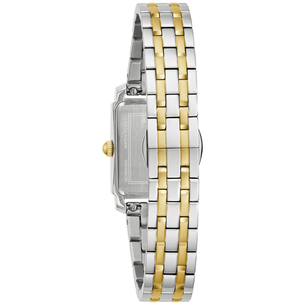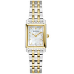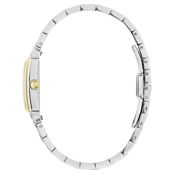 This Bulova ladies’ timepiece brings new style to the already sophisticated Sutton Collection. An elegant two-tone stainless rectangular steel case is paired with a matching bracelet.