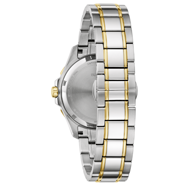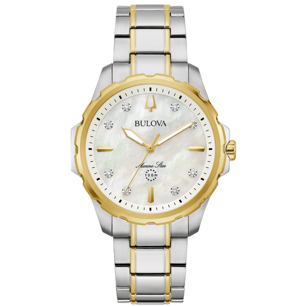 From the legendary Bulova Marine Star collection, this sporty and elegant ladies’ timepiece offers unrivalled style. The gold and silver-tone stainless steel case features a modern design with a bold fixed bezel and symmetrical case flanks.