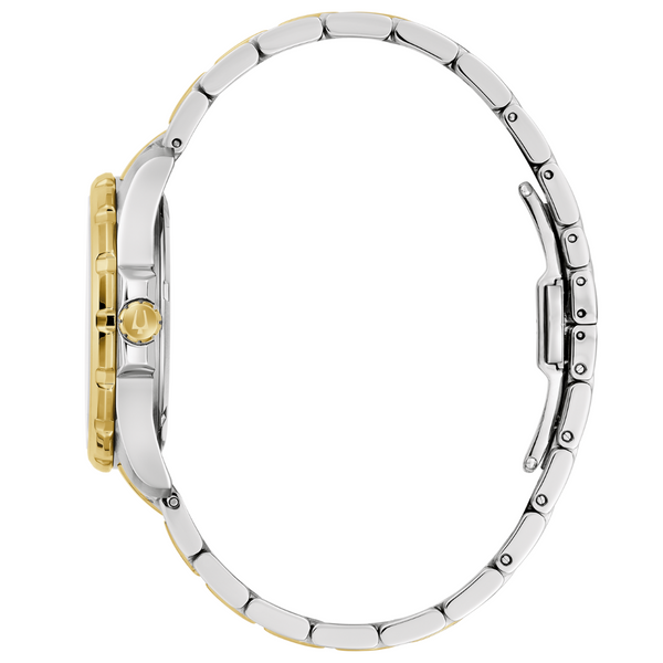 The watch is paired with a matching two-tone quick-release stainless steel bracelet with a push-button deployment closure that provides both comfort and security. For timeless elegance no matter the occasion, this Bulova ladies’ timepiece makes the perfect companion.