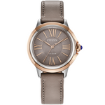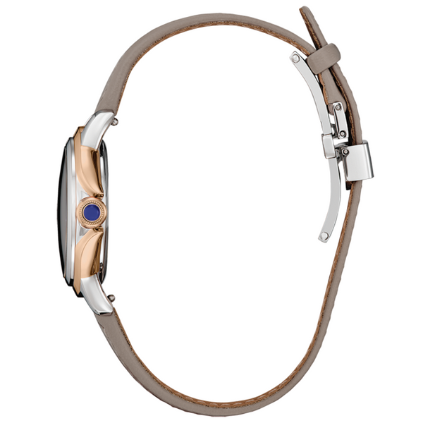 The Ceci from our Citizen L collection offers an elegant and glamorous silhouette. Featuring a silver-tone and pink gold-tone stainless steel case, its distinct shape is punctuated by a synthetic sapphire conochon set crown. On the dial, the taupe display features pink gold-tone accents, with the slim lines of the Roman numeral indices matching those of the hands.