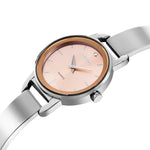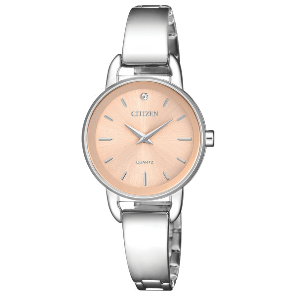 This fashionable Citizen ladies' timepiece is sleek and feminine. Featuring a stainless steel case and bangle-style bracelet, perfectly complemented by the pink dial with a crystal marker at 12 o'clock.